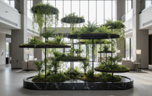 Les Écosystèmes Étagés : Chaque plateau est une composition unique : des fougères vaporeuses, des palmiers miniatures et des mousses denses. Les cascades reviennent avec grâce, créant un lien visuel entre les différents niveaux.